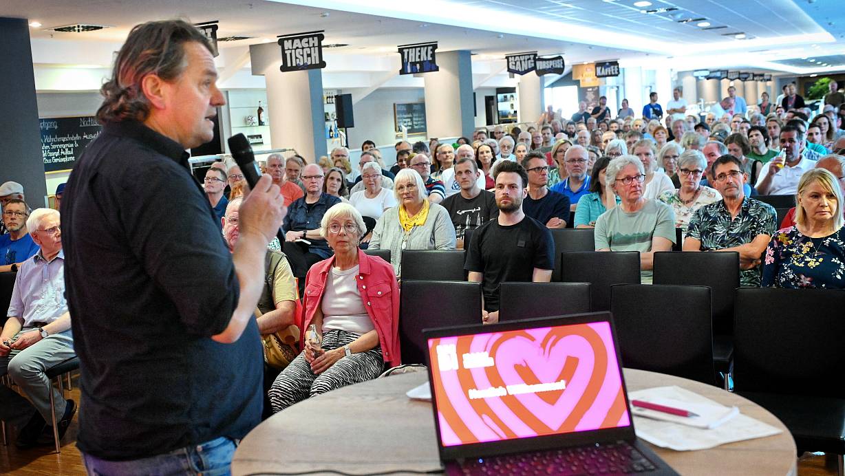 Verkehrsdezernent Martin Adamski begrüßte am Mittwoch im „Stammtisch“ der Schüco-Arena rund 300 Besucherinnen und Besucher zum Bürgerdialog über die geplante Fahrradroute zwischen der Innenstadt und der Universität. | © Barbara Franke