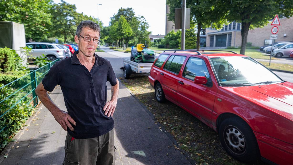 Landschaftsgärtner Gerd Jurkat-Micheel hat sein Gespann an der Rheinallee notgedrungen auf dem schmalen Grünstreifen geparkt. | © Sarah Jonek Fotografie