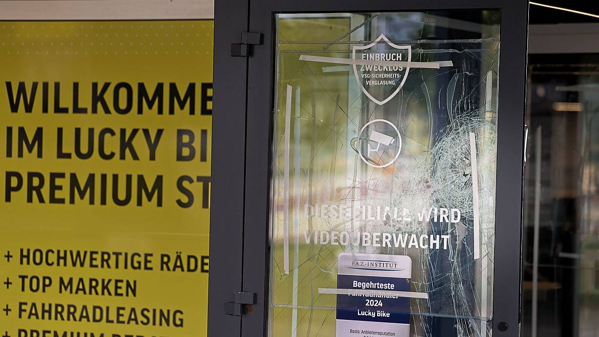 Deutlich sind noch die Einbruchsspuren am Eingang des Radgeschäftes Lucky Bike in Brackwede zu sehen. | © Oliver Krato