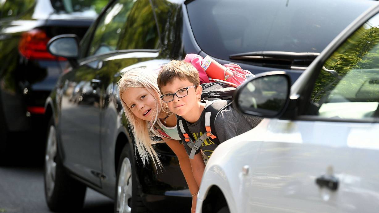 Karlotta und Janne (beide 7) stehen zwischen zwei Autos und checken den Autoverkehr. | © Symbolforo: Holger Hollemann/dpa