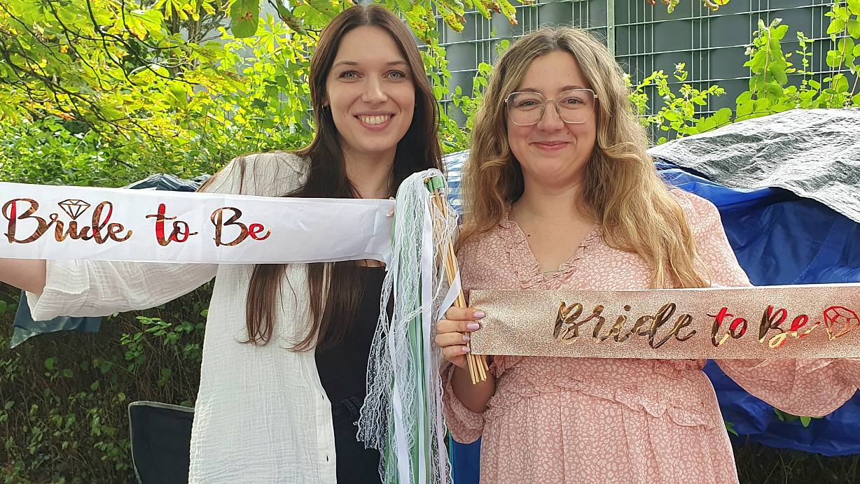 Alina und Denise (v.l.) verkaufen Sachen von ihren (noch ganz frischen) Hochzeiten. Keine Sorge, die beiden sind weiter glücklich. | © Kurt Ehmke