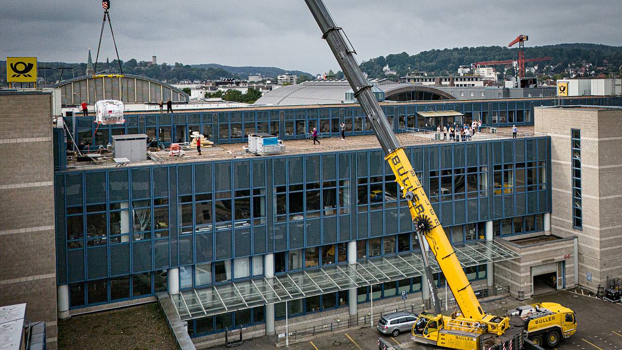 Spektakulär: 1,5-Millionen-Euro-Gerät schwebt in Bielefeld am Haken durchs Dach