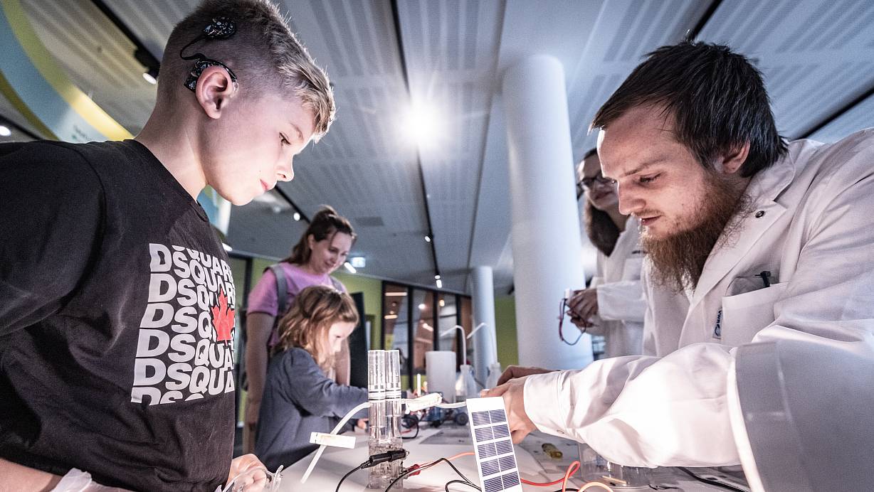 Der neunjährige Levi wird von Sebastian Glomb in die Geheimnisse der Wasserstoffgewinnung eingeweiht - und erfährt, dass man mit Wasserstoff knallen kann. | © Mller