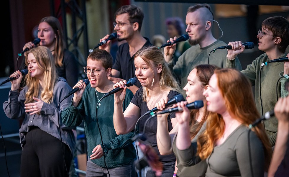 Bei der Erstsemesterbegrüßung sprachen neben Angelika Epple auch Bürgermeister Andreas Rüther sowie Charlotte Schäfer und Jasmin Azari vom Allgemeinen Studierendenausschuss (AStA) auf der Bühne vor dem Westend. Der Chor „enchoired“ vom Fachsprachenzentrum der Universität begleitete die Erstsemesterbegrüßung musikalisch.