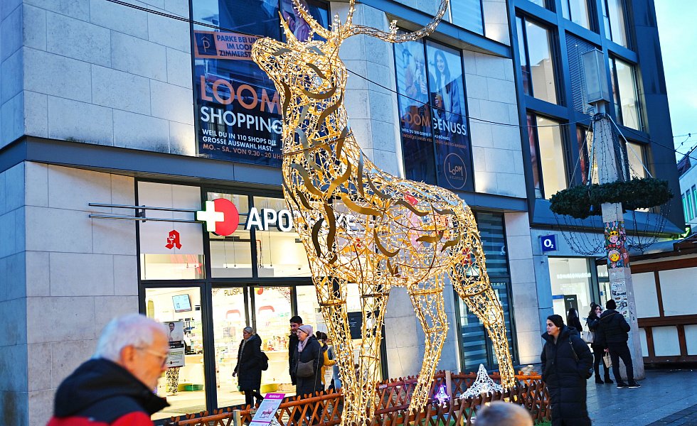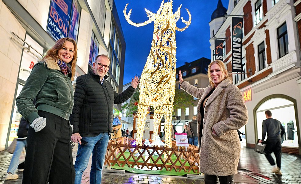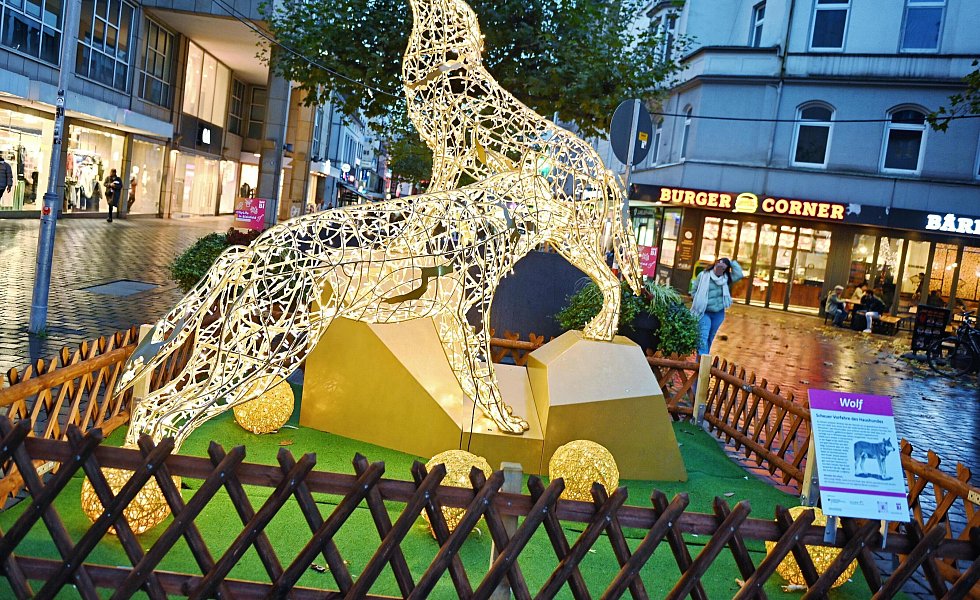 Bielefeld. In der Innenstadt sind die Tiere los. Bis Februar gibt es beim Einkaufsbummel in der Bielefelder Bahnhofsstraße leuchtende Wölfe, Rothirsche und andere Wildtiere zu entdecken. Bei den insgesamt fünf Lichtinstallationen handelt es sich um ein Projekt des City-Managements Bielefeld. Die leuchtenden 3D-Skulpturen stellen tierische Bewohner des Heimat-Tierparks Olderdissen dar und sollen Besucher auch nach der Weihnachtszeit erfreuen.