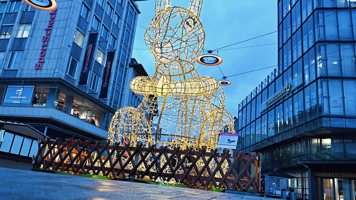 „Beschissen“, findet Mechthild Seel das Eichhörnchen auf dem Jahnplatz. Ein solches Draht-Ding könne einfach nicht mit einem traditionellen Weihnachtsbaum konkurrieren und zum Weihnachtsmarkt gehöre eben einfach etwas Grün dazu, sagt die Rentnerin. Die Stadt sei ihr im Winter ohnehin schon zu grau und trostlos. Das würden die Drahtkonstruktionen nur schlimmer machen. „Ich kann damit auch nichts anfangen“, stimmt ihre Schwester Ursula Berndt zu. Sie komme aus Dortmund, kenne von dort einen riesigen, bunt dekorierten Weihnachtsbaum. Dagegen sei die Deko hier einfach langweilig. „Ein Eichhörnchen hat doch nichts mit Weihnachten zu tun, das kann man doch auch im Sommer hinstellen“, sagt sie.