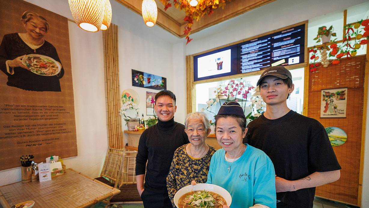 Anh Duy Nguyen (v. l.), Namenspatronin und Rezept-Erfinderin Gái Nguyen, Chefin Thi Phuong Mai Nguyen und Gia-Bao Qiu mit einer dampfenden Schüssel Phô-Suppe. | © Oliver Krato