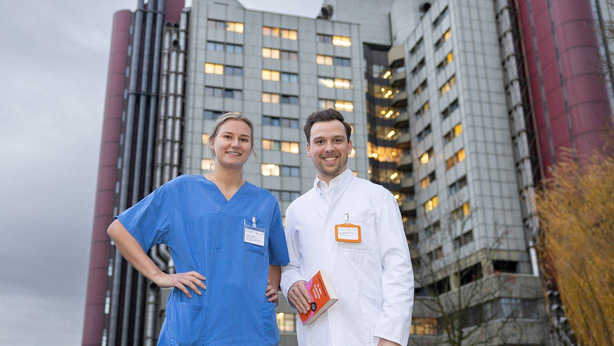 Zwei von insgesamt 468 Ärzten: Alexandra Zillmer (28) und Richard Krüger (31) vor dem Klinikum Bielefeld. | © Oliver Krato