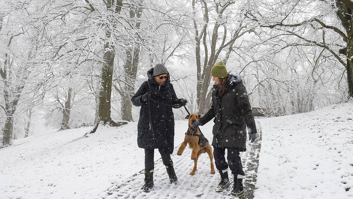 Malgorzata Beutler und Heike Kleinhans sind mit Hund Jo am Johannisberg im Schnee unterwegs. | © Jörg Dieckmann