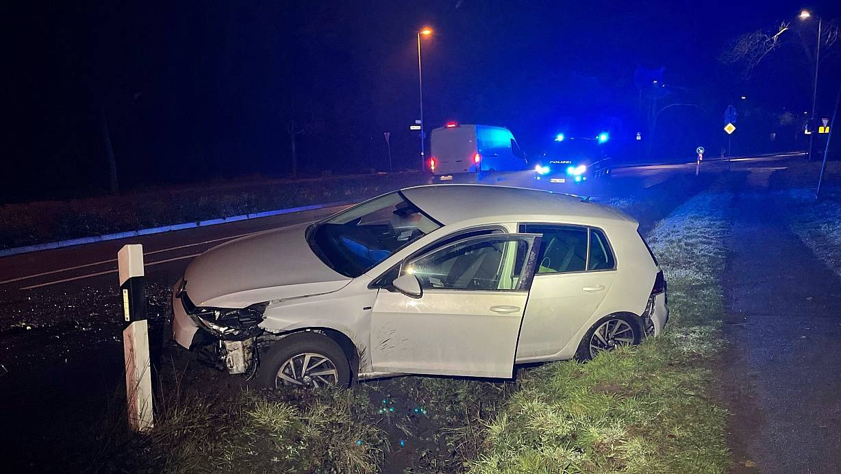 Nach einer längeren Irrfahrt landete der weiße VW Golf in diesem Graben an der Heeper Straße. Das Fahrzeug ist schwer beschädigt. | © Polizei