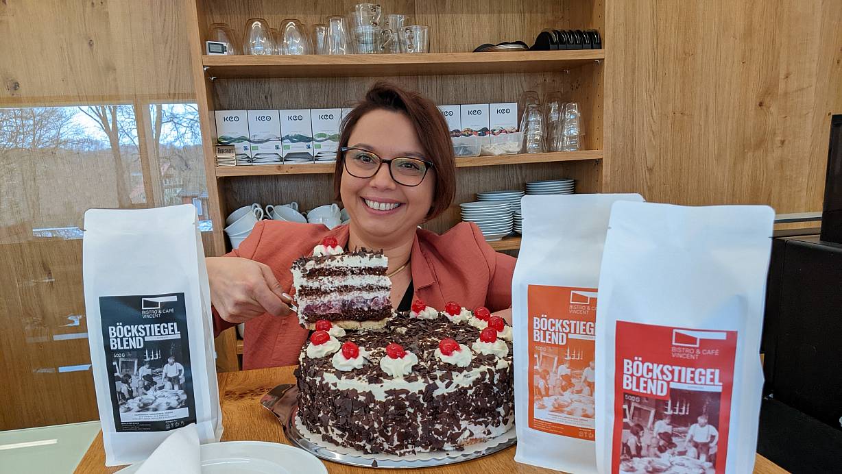 Ülker Örnek präsentiert stolz ihre Schwarzwälder Kirschtorte im Café Vincent, flankiert von den hauseigenen Böckstiegel-Blend Kaffeespezialitäten. | © Anja Hanneforth