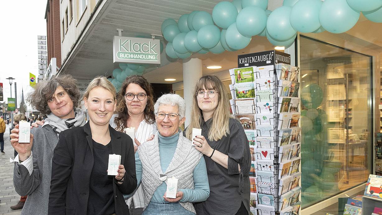 Team Zuversicht: Gina Just (2.v.l.) und ihre Mitarbeiterinnen Eléna Consino (v.l.), Heike Kirchner, Ulla Loewner und Bianca Henke vor dem neuen Standort der Buchhandlung Klack an der Hauptstraße 113. | © Dieckmann-Fotodesign l Bielefeld