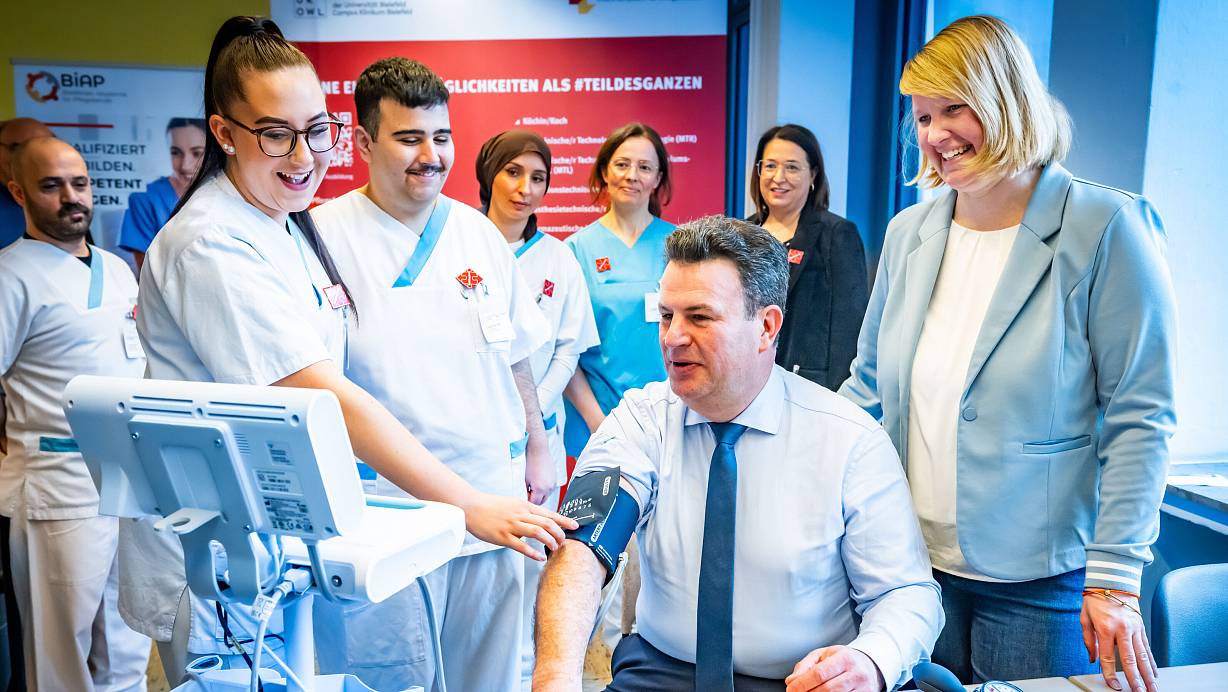 Minister Hubertus Heil lässt sich von Antonia Wend (links) und Zeravan Misto Aldo den Blutdruck messen. Die Bieleelder SPD-Bundestagsabgeordnete Wiebke Esdar (rechts) schaut zu. | © Sarah Jonek