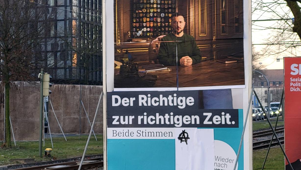 Friedrich Merz ist auf diesem Plakat der CDU am Adenauerplatz mit einem Bild des ukrainischen Präsidenten überklebt worden. | © K. Wenzel
