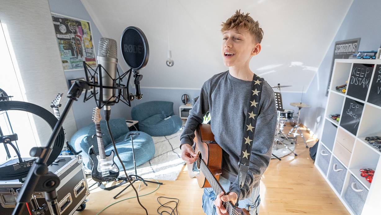 Max macht Musik in seinem Jugendzimmer unterm Dach seines Elternhauses im Bielefelder Stadtteil Jöllenbeck. Ein paar Gitarren stehen hier und ein Schlagzeug. | © Oliver Krato