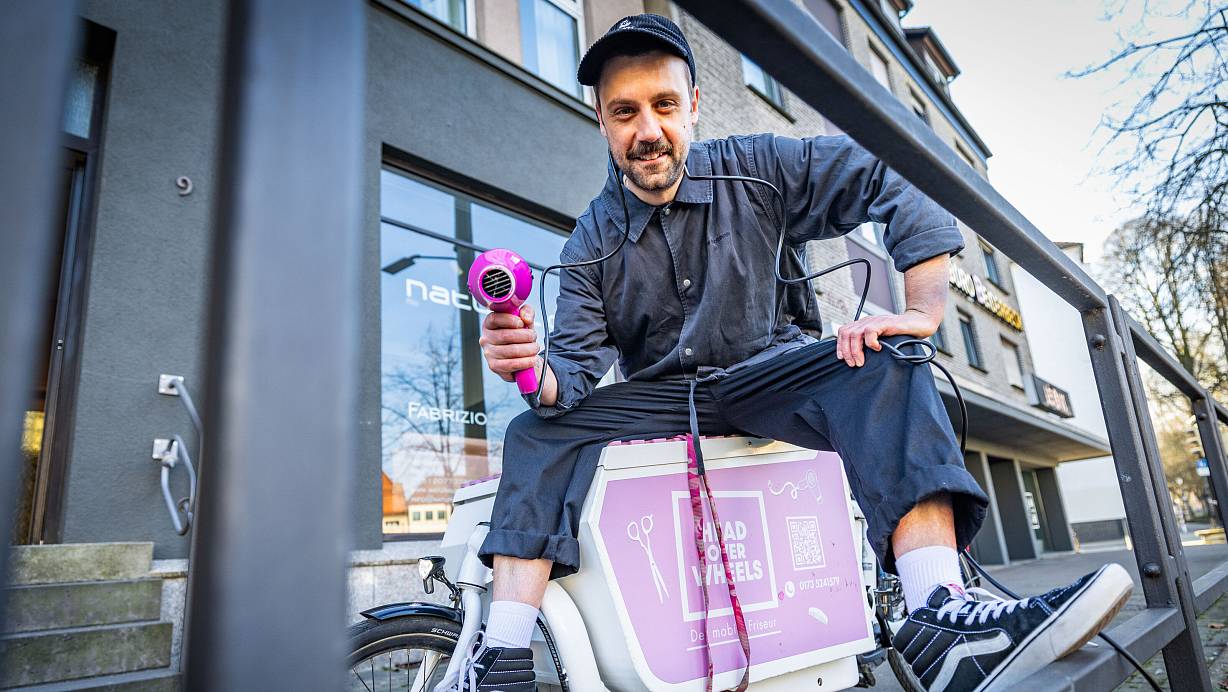 Friseurmeister Piotr Luszczek entschied sich gegen einen eigenen Laden und lieber für ein Lastenrad. Jetzt strampelt er sich mit „Head over Wheels“ in Bielefeld für seine Kunden ab. Nur eine Sache müssen sie beim Hausbesuch selbst stellen.