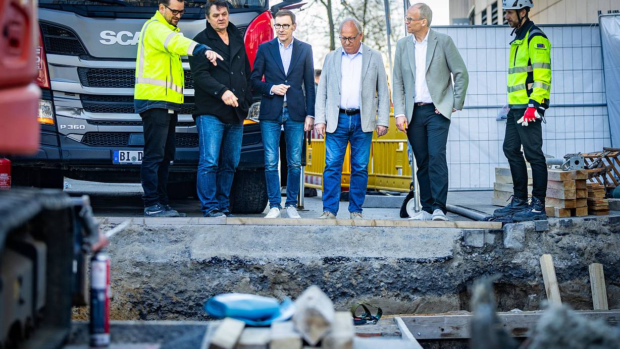 Informierten sich an der Baustelle Kreuzstraße: (von links) Stadtwerke-Geschäftsbereichsleiter Nils Neusel-Lange, Verkehsdezernent Martin Adamski, Amtsleiter Olaf Lewald, Oberbürgermeister Pit Clausen, Stadtwerke-Chef Martin Uekmann und Projektleiter Lennard Kuch. | © Sarah Jonek