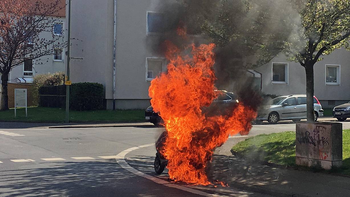 Bielefeld. Ein brennender Motorroller sorgte am Donnerstagabend für einen Feuerwehreinsatz in einem Park in Bielefeld-Heepen. Wie die Polizei mitteilt, rief ein Anwohner gegen 21 Uhr die Feuerwehr, nachdem er aus einer Parkanlage nahe der Straße Alter Postweg Flammenschein wahrgenommen hatte. Als sich der Anwohner auf den Weg zur Brandstelle machte, sollen ihm zwei Jugendliche entgegengekommen sein, die sich über eine Nebenstraße zügig aus dem Staub machen wollten.