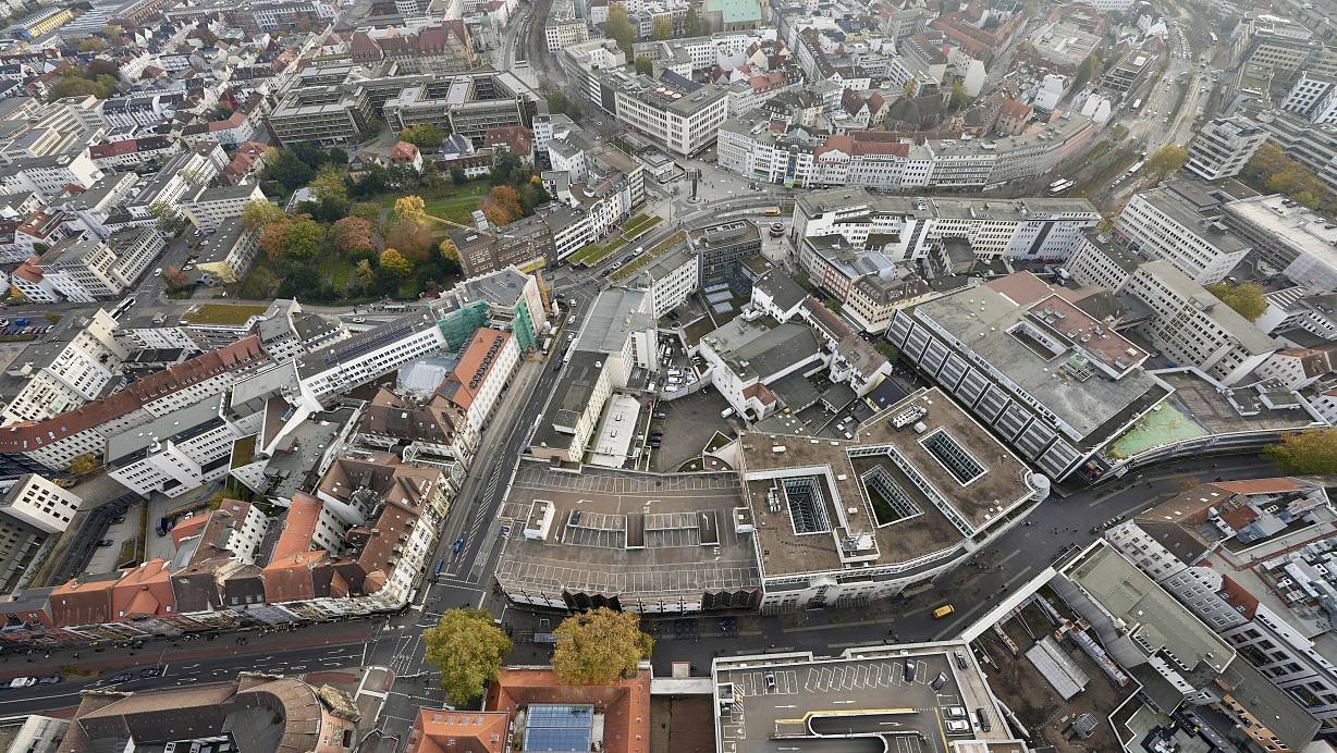 Bielefelds Innenstadt aus der Vogelperspektive: Gerade rund um die Bahnhofstraße (rechts im Bild der Karstadt-Komplex) gibt es stadtplanerisch einiges aufzuholen. | © Peter Unger