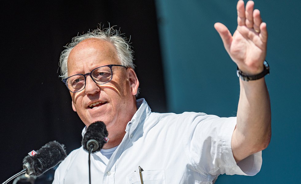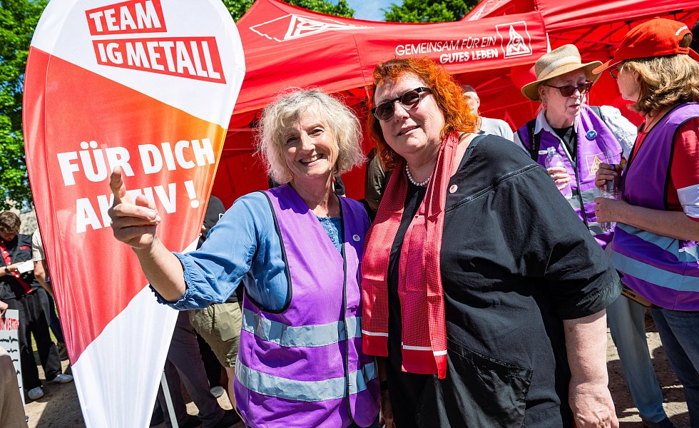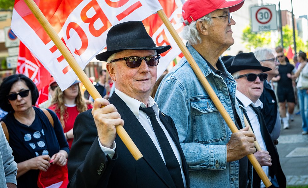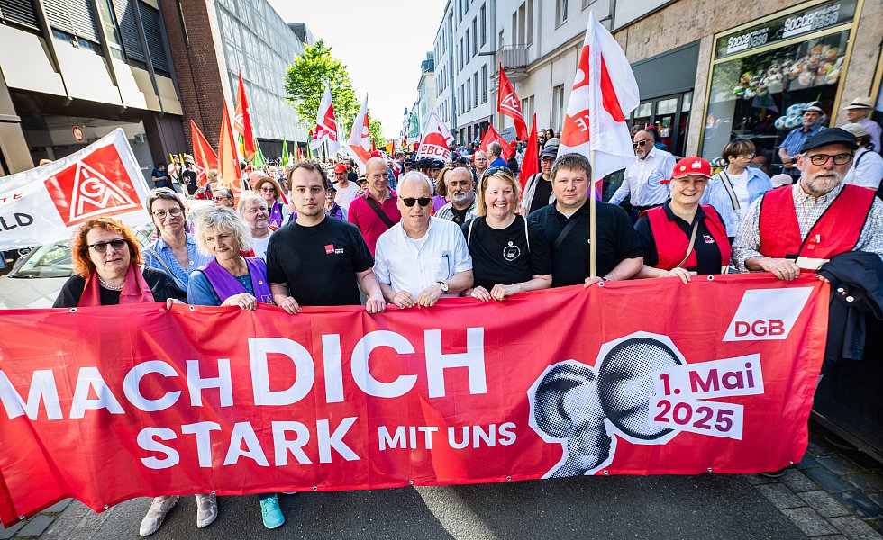Vorher versammelten sich bereits ungefähr 2.000 Personen vor der Zentrale der IG Metall an der Marktstraße, um diesen Forderungen auch auf der Straße Ausdruck zu verleihen: Sie umfassen in diesem Jahr unter anderem mehr Investitionen in die öffentliche Infrastruktur, einen höheren Mindestlohn und die Beibehaltung des Acht-Stunden-Tages.