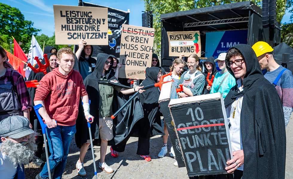 Widerspruch dürfte sie hiermit bei der Jugendorganisation der Linkspartei sammeln. Diese kritisierte durch eine Schauspiel-Performance auf der Kundgebung den, ihrer Meinung nach falschen Fokus des Koalitionspapiers: Die Mitglieder der „Jungen Linken“ haben sich als „Kürzungs-Sekte“ verkleidet und verlesen einen Zehn-Punkte-Plan, mit dem sie die Sparpläne der Merz-Regierung ironisch kommentieren.