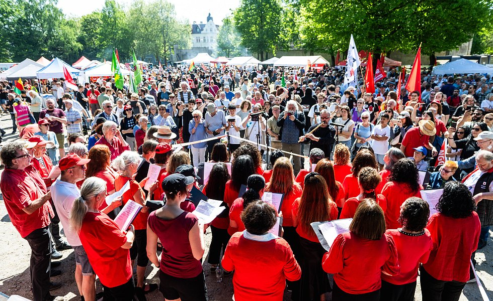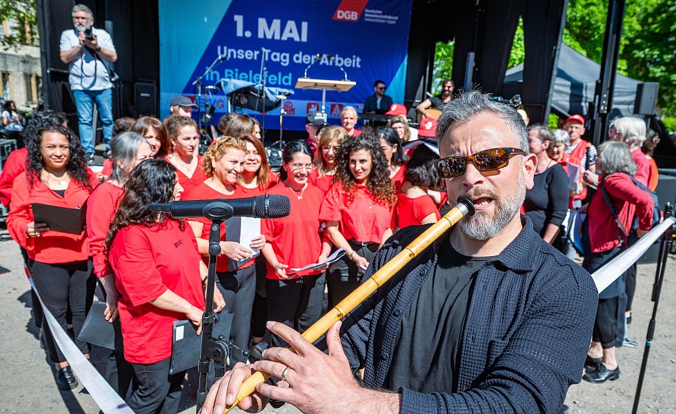 Bielefeld. Rund 3.500 Menschen folgten am Morgen des 1. Mais dem Aufruf des Deutschen Gewerkschaftsbundes und nahmen unter dem Motto „Mach dich stark mit uns“ an der Kundgebung zum Tag der Arbeit im Ravensberger Park teil. Neben internationalem Essen und einem abwechslungsreichen Musikprogramm standen hierbei vor allem die inhaltlichen Forderungen des DGB im Vordergrund.