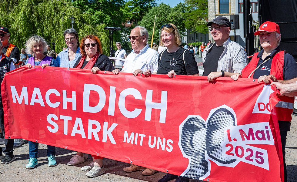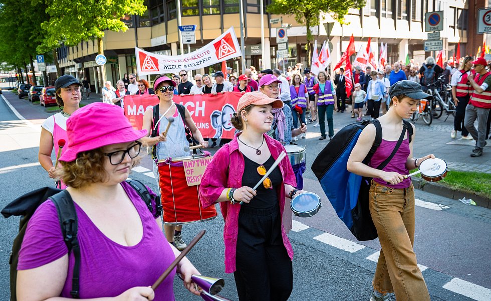 Mehr Einigkeit herrscht im Kampf gegen den Rechtsruck: Während Oberbürgermeister Pit Clausen in seiner Rede die Rolle des DGB beim Aufbau demokratischer Strukturen nach dem Krieg betont, gibt Ute Herkströter von der IG Metall sich in ihrer Rede kämpferisch: „Rechtsextremismus hat schon einmal unendliches Leid über unser Land gebracht und Millionen das Leben gekostet. Rechtsextremismus ist keine Meinung unter vielen“, betont die Gewerkschaftssekretärin.