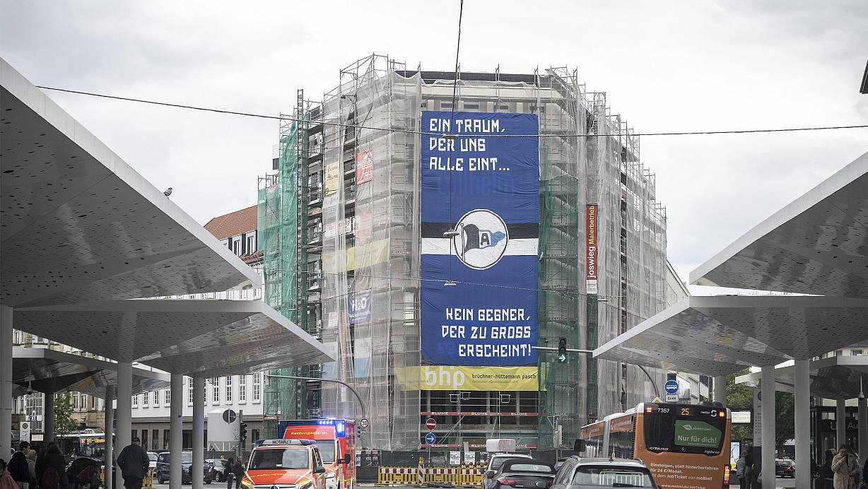Im Herzen der Bielefelder City hängt in 30 Metern Höhe ein emotionaler Mutmacher der Fanszene. Volksbank und Bielefeld Marketing haben die Aktion unterstützt.