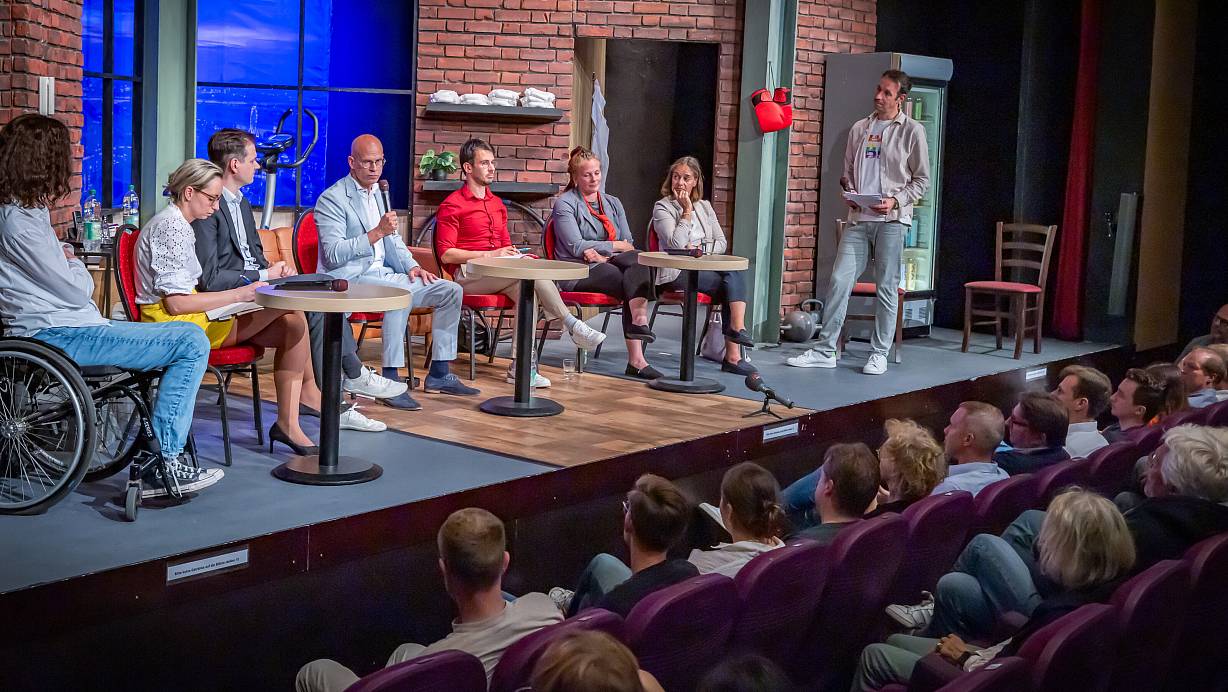 Wo aktuell eigentlich Jochen Busse in "Weiße Turnschuhe" auf der Bühne steht, diskutierten (v.l.) Florian Sander (AfD), Christiana Bauer (CDU), Dominic Hallau (Grüne), Ingo Nürnberger (SPD), Onur Ocak (Die Linke), Lena Oberbäumer (Die Partei), Jasmin Wahl-Schwentker (FDP) und Moderator Timo Fratz. | © Sarah Jonek