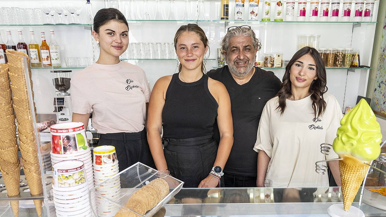 Gastronom Ali Kurt und ein Teil seines Eiscafé-Teams: Wlada (links), Mila und ganz rechts Esra. | © Jörg Dieckmann