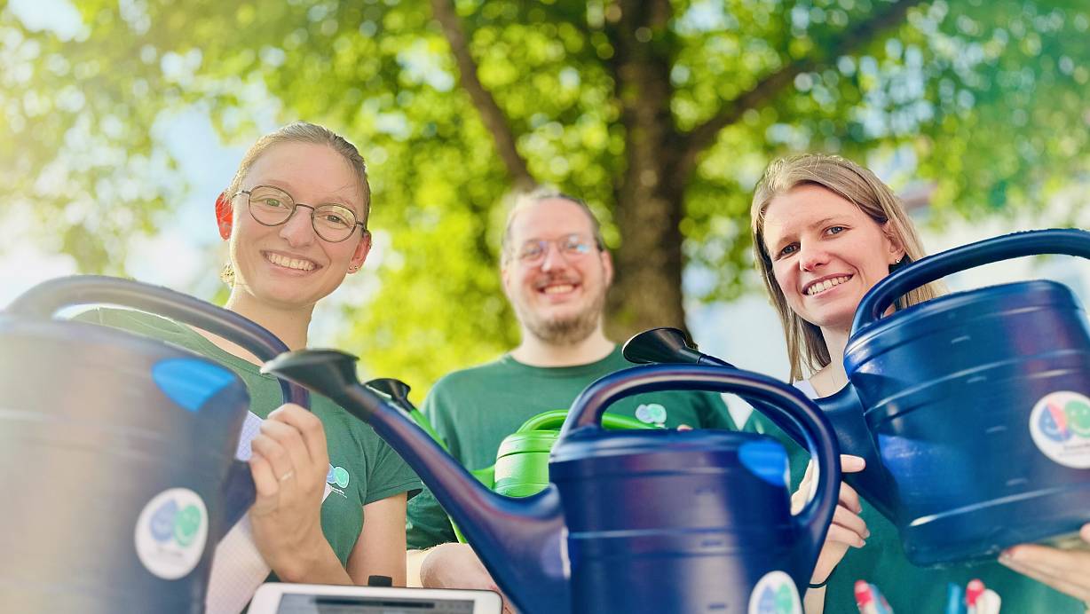 Wie es den Bäumen im Stadtgebiet geht, davon erzählt das Team am Stand auf dem Abendmarkt und reicht kleine Quizbögen zum Erkunden der Botanik auf dem Klosterplatz. Als kleines Dankeschön erhalten die Teilnehmenden eine Fünf-Liter-Gießkanne – das analoge wie symbolische Gerät für die kommenden „BaumBie“-Einsätze. „Diesen Donnerstag sind wir 16 Gießkannen losgeworden, beim ersten Auftritt waren es trotz des Regens immerhin 7 - von einem Viertel des Preisgeldes haben wir 100 Stück gekauft, damit wir unsere Aktion weiter bewerben können.“ Wobei neben Passanten mit Interesse am Erhalt des Stadtgrüns auch verschiedene Institutionen auf sie zugekommen seien, wie der BUND, Greenpeace oder die Stadt Gütersloh.
