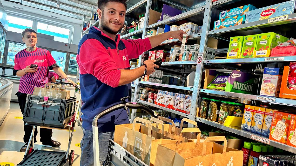 Einkaufen im Zeitraffer-Tempo: Die Flink-Mitarbeiter Fabienne Cimino und Marco La Grotteria sind als „Picker“ unterwegs und sammeln die bestellten Waren ein. Das Ziel: Acht Sekunden pro Produkt. | © Eike J. Horstmann
