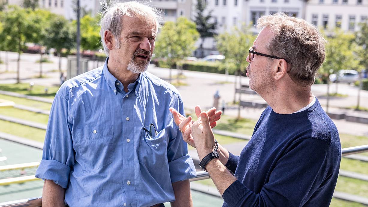 Andreas Thiel (l.), Unternehmer im Ruhestand, im Sommergespräch über dem Kesselbrink, mit NW-Redakteur Stefan Brams. | © Mueller