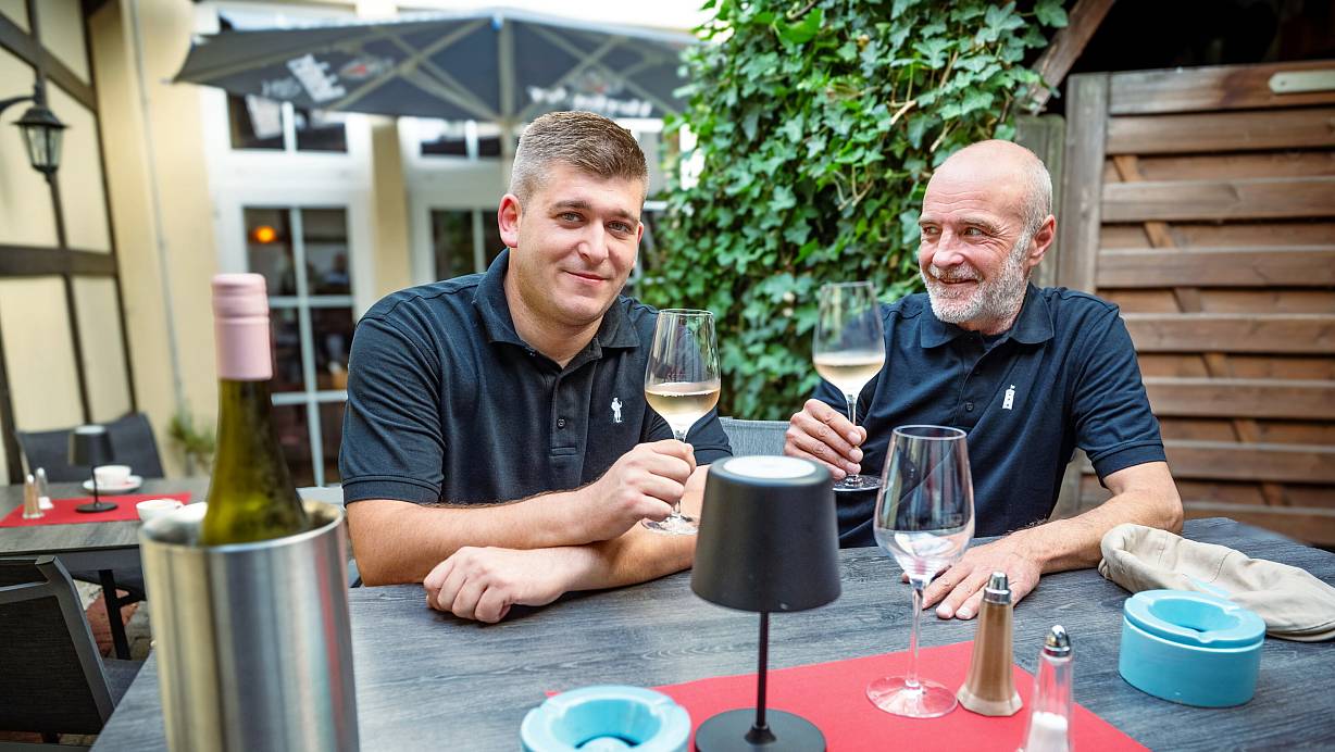 Nur rund zehn Quadratmeter misst der Biergarten, in dem sich Dennis Krämer (l.) und Gert Winter nach Feierabend mit einem Wein stärken. | © Barbara Franke