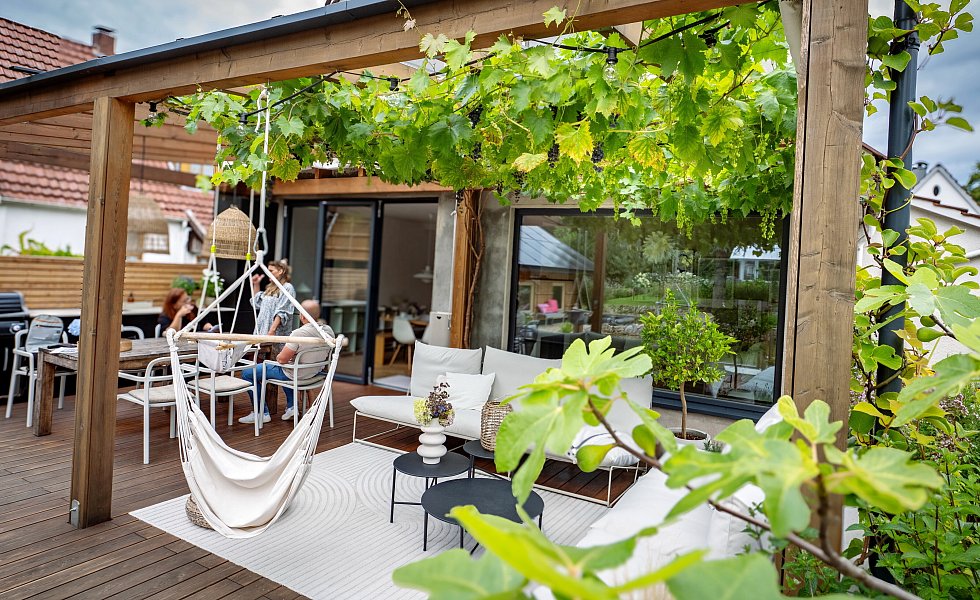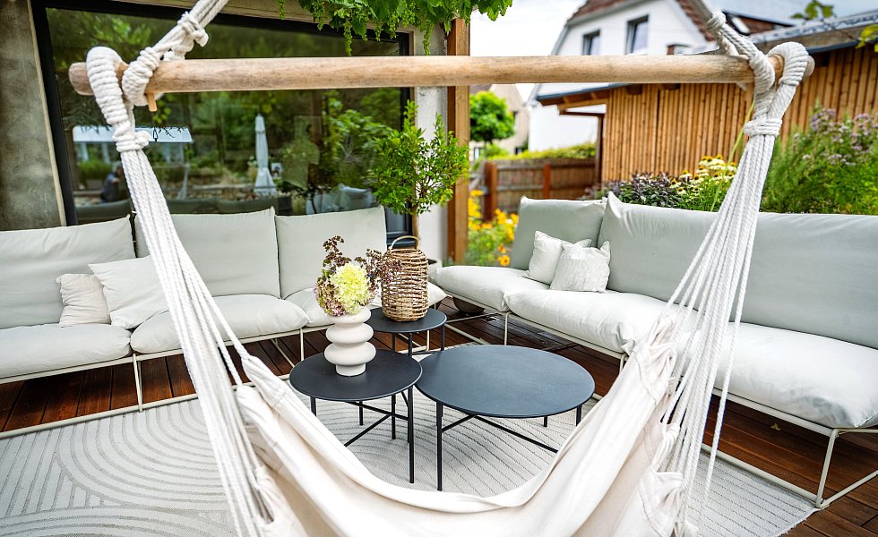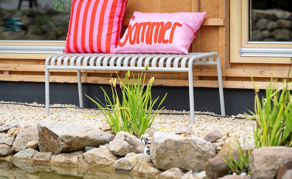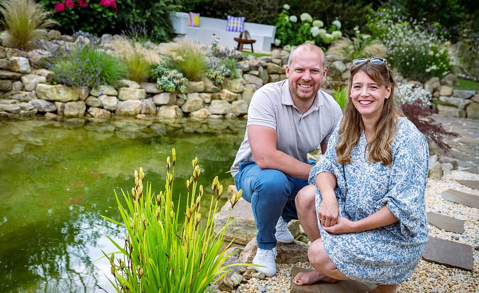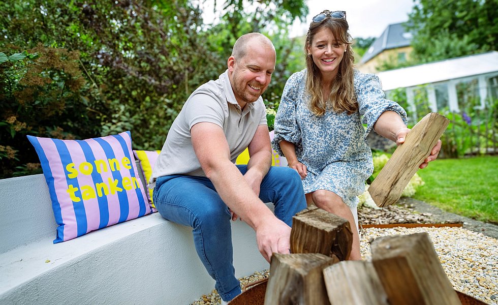 Nach dem Einzug 2021 ging es sofort an die Sanierung und Gestaltung von Terrasse, Garten und Teich. „Dafür habe ich einen Kleinbagger gemietet“, berichtet Lutz Hermanns. Wichtig war den Bielefeldern, dass der Teich zum Schwimmen geeignet ist. 28 Tonnen Steine hat das Ehepaar verbaut. „Das ist Ibbenbürener Sandstein“, sagt der 41-Jährige. In der Stadt, die im Tecklenburger Land liege, gebe es ein Unternehmen, bei dem man sich Musterteiche ansehen könne.