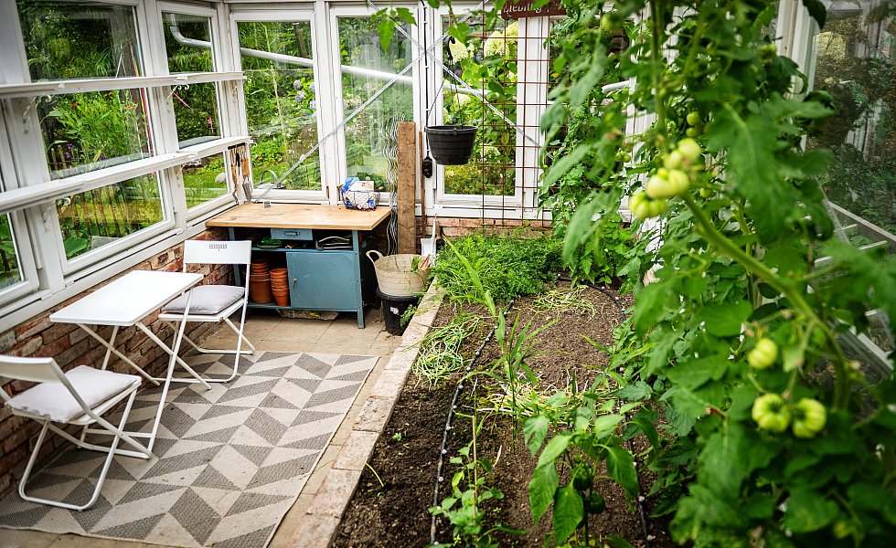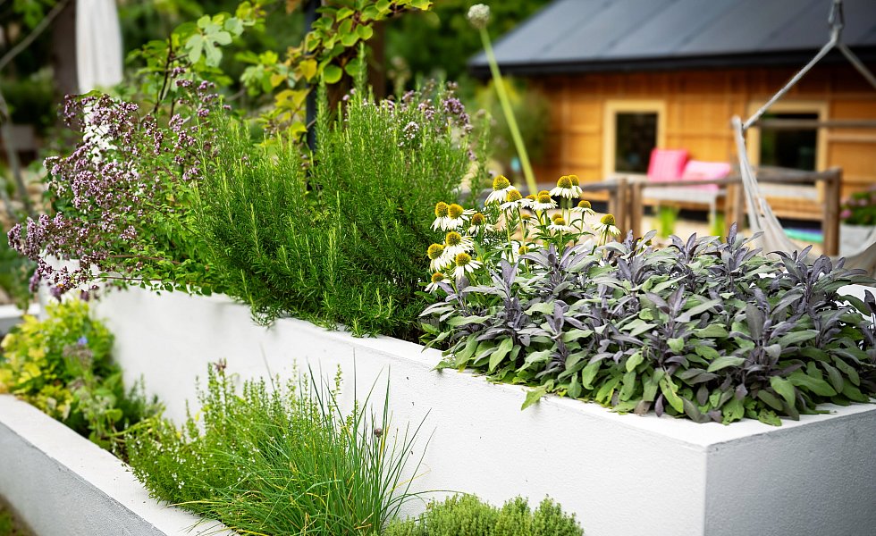 Das Gewächshaus, in dem Paprika und Tomaten gerade reifen, hat er auch selber gebaut – aus recycelten Fensterrahmen. Ein bisschen versteckt befindet sich eine kleine Sitzecke, umrahmt von Sommerflieder, Zierquitten, einem Feigenbaum und heimischen Gehölzen. Dieses Jahr haben Jana und Lutz Hermanns zum ersten Mal am Tag der offenen Gartenpforte teilgenommen. „Es war viel los, 70 bis 100 Besucherinnen und Besucher waren über den Tag verteilt da“, berichten die Hausbesitzer. Der würzige Duft von Rosmarin, Thymian, Estragon und Oregano ließ so manchen Kräuterfan auf die Knie gehen, um an den kleinen Blüten zu schnuppern.