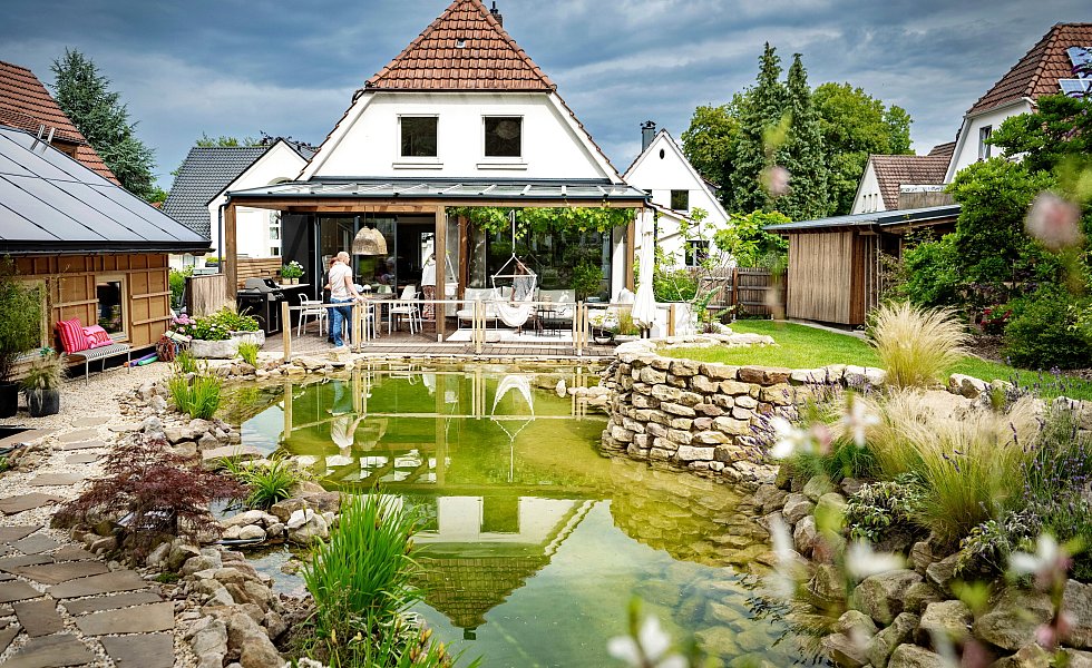 Bielefeld. Zuerst fällt der Blick auf den Teich. Er ist nicht einfach nur rund oder quadratisch, sondern schlängelt sich in die Landschaft. Zwischen hellen Sandsteinen plätschert das Nass in das 1,30 Meter tiefe Wasserbecken. „Wir haben das Haus 2020 gekauft“, sagt Jana Hermanns. Dass es schon über 100 Jahre alt ist, sieht man heute nicht mehr. Auch wenn der Familie, zu der Ehemann Lutz und drei Töchter gehören, klar war, dass eine Menge Arbeit auf sie wartet, ging es nach der Besichtigung Am Lauksberg plötzlich ganz schnell.