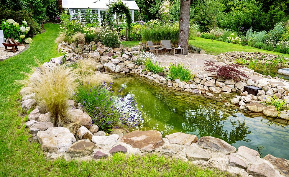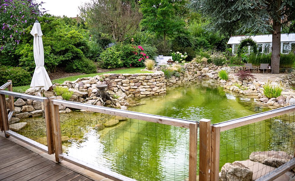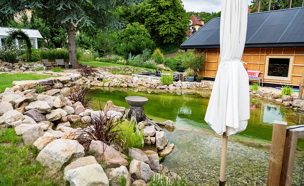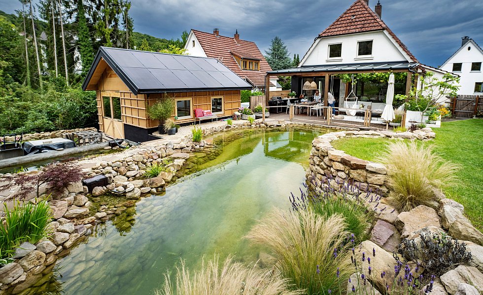 Die Steinmauer des Teiches, an dessen Rand sich inzwischen Gräser im Wind wiegen, hat eine Höhe von 1,50 Meter. Inzwischen haben Molche Einzug in das klare Wasser gehalten, das mithilfe eines Filtersystems saubergehalten wird. Jana Hermanns freut sich: „Molche fressen kleine Schnecken. Wir hatten letztes Jahr so viele Schnecken, dass wir abends den Rasen nicht mehr betreten konnten.“ Auch Graureiher und Eisvogel haben am Schwimmteich schon Rast gemacht.