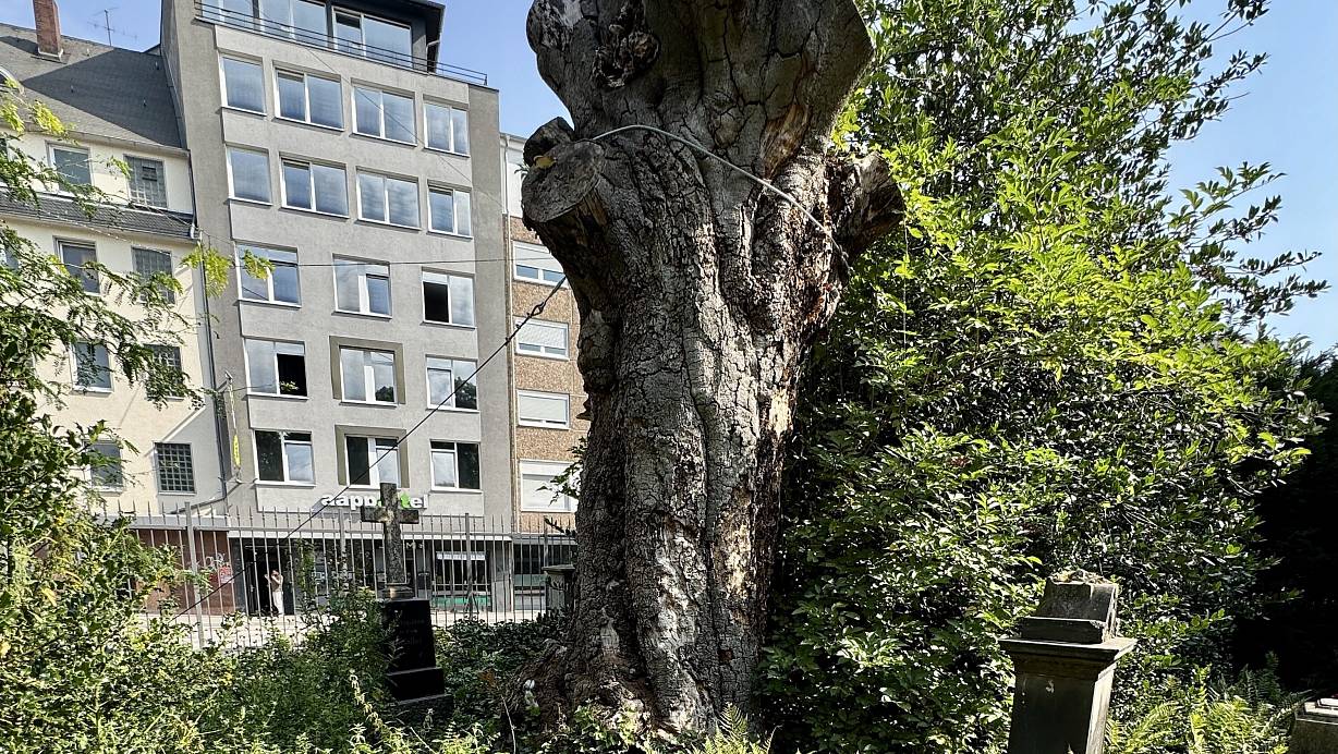 Der alte Blutbuchen-Stumpf auf dem Alten Friedhof musste jetzt mit Drahtseilen gesichert werden. Oben am Stamm regt sich neues Leben. | © Peter Unger