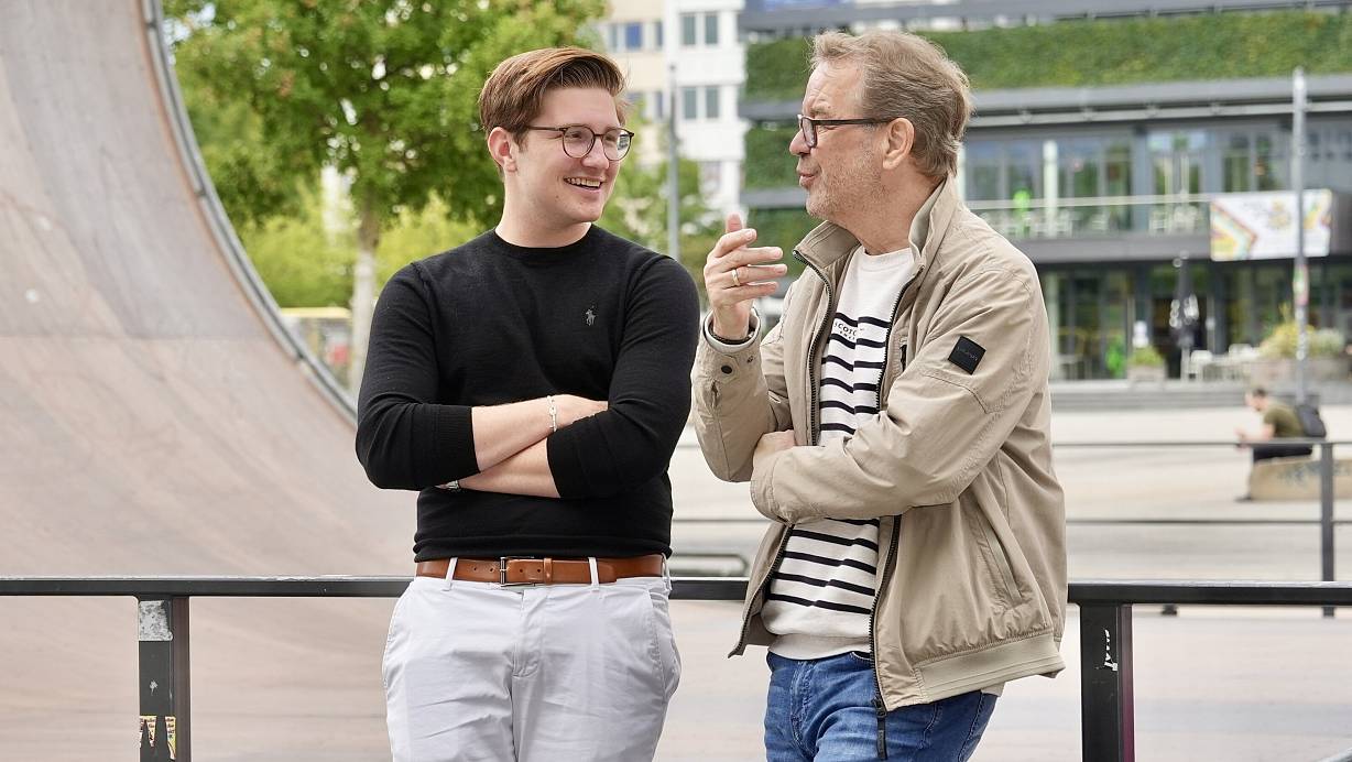 Linus Runge (18) und NW-Redakteur Stefan Brams stehen beim Sommergespräch an der Halfpipe auf dem Kesselbrink. | © Peter Unger