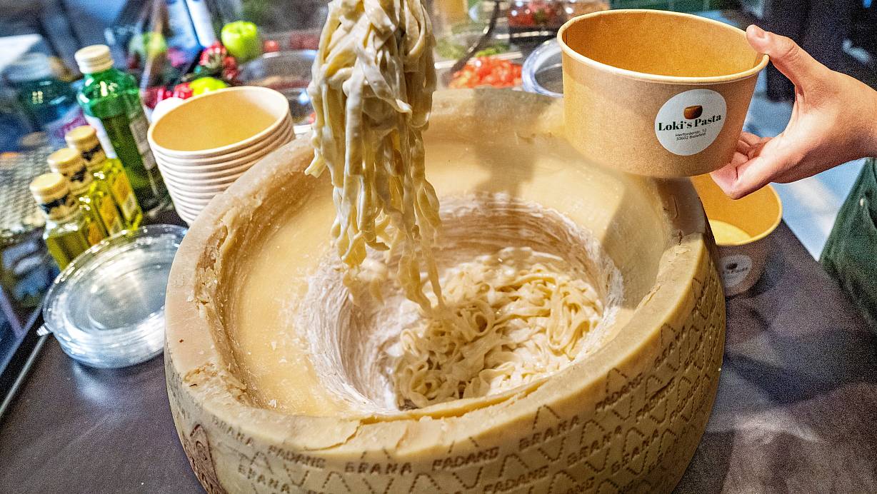 Im neuen Bielefelder Restaurant "Loki's Pasta" werden die Nudeln "Alfredo" im großen Käselaib geschwenkt, bevor sie mit Soßen und Topping verfeinert werden. | © Barbara Franke