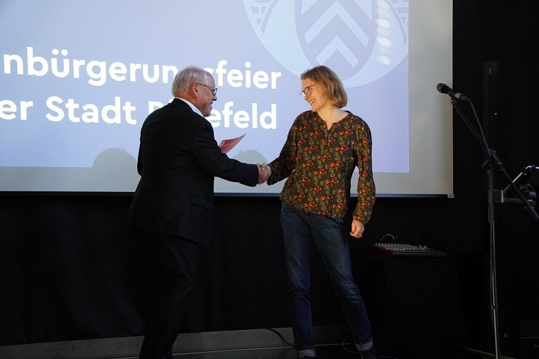 Für Emotionalität sorgten die anschließenden Interviews: Ein indisches Paar – sie Softwareentwicklerin, er Wissenschaftler – erzählte, dass Bielefeld mittlerweile für die gemeinsame Familie zur zweiten Heimat geworden sei. Ein Syrer schilderte, dass sein allererster Kauf nach der Ankunft eine Regenjacke war. Und eine frisch eingebürgerte Amerikanerin fand die passenden Worte: „Ich habe Bielefeld in mein Herz geschlossen.“