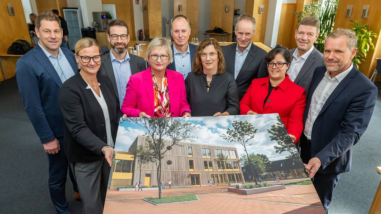 Individuelle Erweiterungsbauten: Jan Birkemeier, (Goldbeck, v.l.), Christine Harodt (ISB), Maik Hinsen (Goldbeck), Schuldezernentin Birgit Beckermann, Landschaftsarchitekt Uwe Gernemann, Jörg-Uwe Goldbeck, Ilona Hannemann (BBVG), Baudezernentin Claudia Koch, Siegfried Wendker (Goldbeck) und Architekt Thomas Brewitt zeigen den Plan für die Grundschule Am Homersen. | © Sarah Jonek