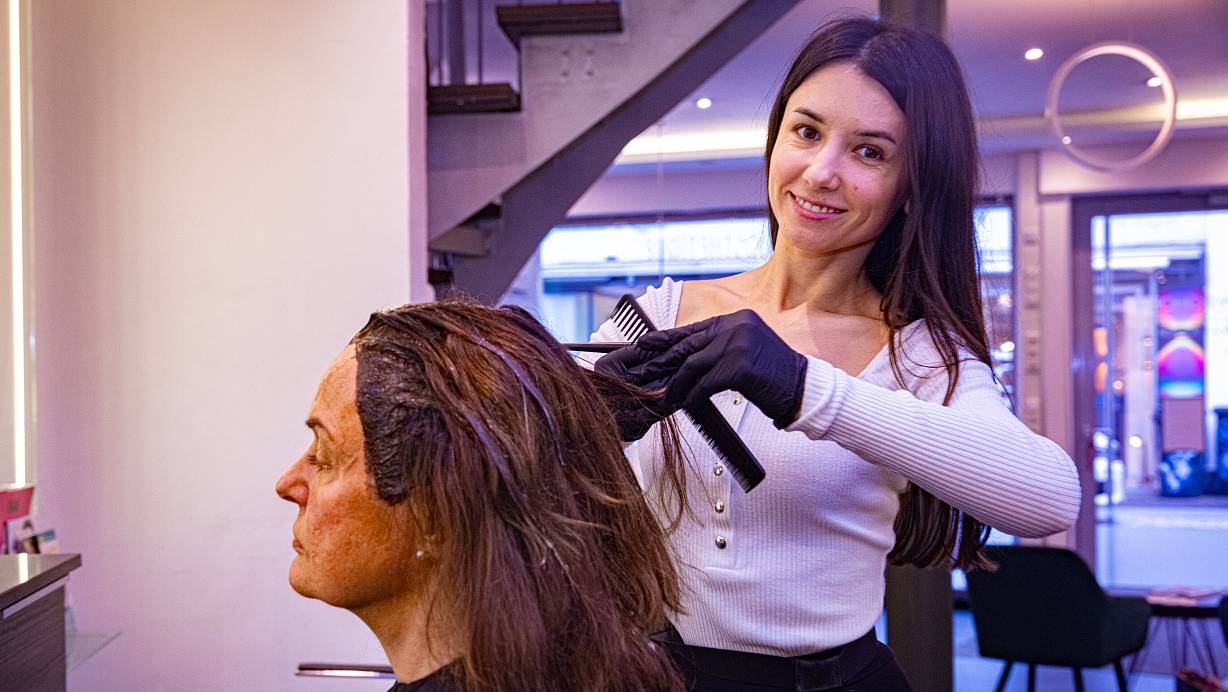 „Ich bin sehr dankbar, dass ich hier arbeiten kann", sagt Inna Makhmutova. Bei der Arbeit, wie hier beim Ansätzefärben im Friseursalon in der Bielefelder Altstadt, lernt sie immer neue Wörter hinzu. | © Mike-Dennis Müller