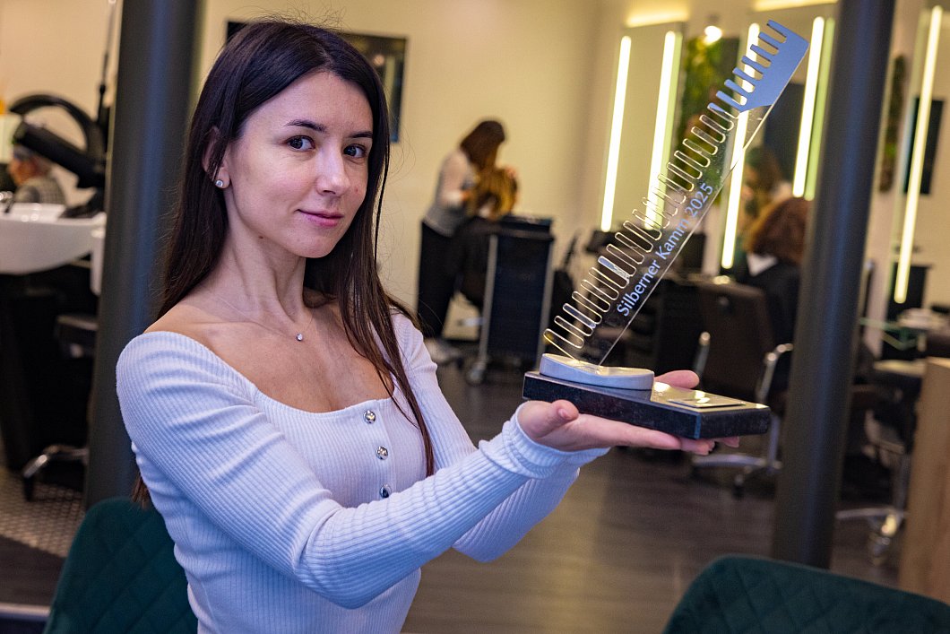 Schneiden trainiere sie aktuell noch an einer Übungspuppe. Aber immer wieder kommen auch Kundinnen, die sich von der Spezialistin außergewöhnliche Frisuren für Hochzeiten oder besondere Veranstaltungen machen lassen. Der Bereich sei nach wie vor ihre große Leidenschaft. Dass sie da außergewöhnlich gut ist, hat Makhmutova jetzt gerade auch bei den Nordwestdeutschen Friseurmeisterschaften in Gütersloh bewiesen. Dort belegte sie den zweiten Platz in der Sonderklasse Damenfach, beim Wettbewerb „Hochstecken“ und gewann den Silbernen Kamm.