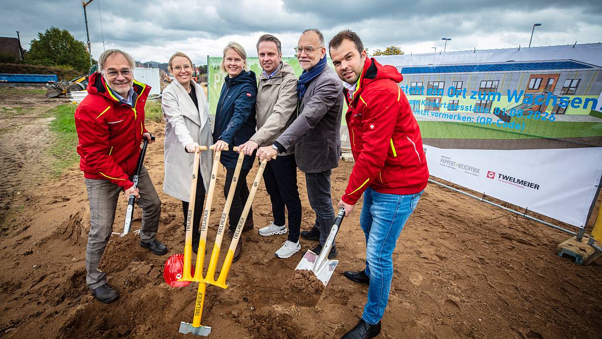 Symbolischer Spatenstich für die neue Kita: Bauunternehmer Nils Twelmeier (v.l.), Architektin Ramona Köppe, Diana Strohbücker (Jugendamt), Björn Wasielke-Buschkamp (von Laer-Stiftung), Architekt Michael Pappert und Andre Schmedkord (Geschäftsführer Twelkamp). | © Mike-Dennis Müller