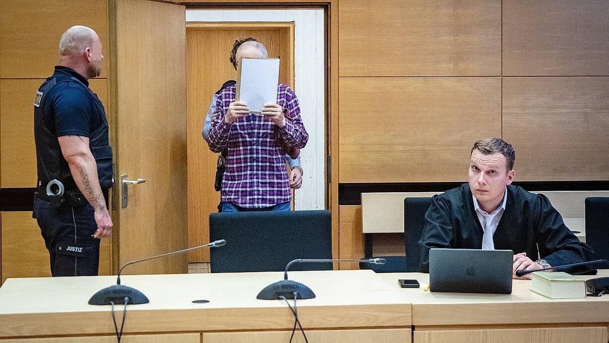 Der Angeklagte verdeckt vor den Fotografen im Gerichtssaal sein Gesicht. | © Mike-Dennis Müller