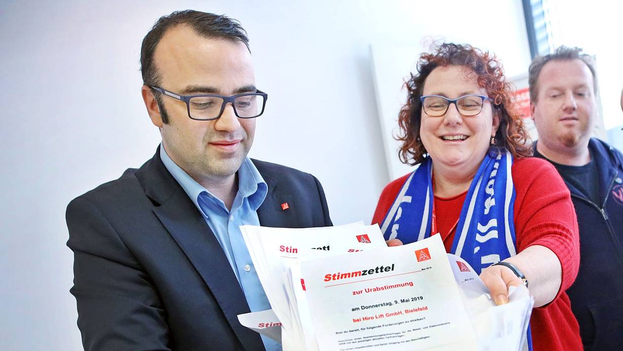 Oguz Önal und Ute Herkströter auf einem Archivbild aus dem Jahr 2019 beim Auszählen einer Urabstimmung beim Aufzugshersteller Hiro Lift. Rechts Vertrauensmann Florian Unruh. | © jonek-fotografie.de