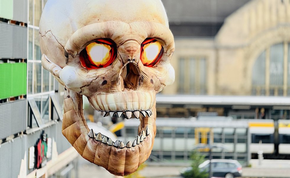 Bielefeld. Schon von Weitem leuchtet der überdimensionale Totenkopf über dem Platz der Ostwestfalen und zieht die unglaublichsten Gestalten magisch an. Originell maskierte Figuren strömen zum Licht, nicht alle sind Reisende der Bahn, die meisten wollen direkt zum Boulevard. Dort beginnt um 18 Uhr das größte Halloween Open-Air der Region, veranstaltet von den Machern des Treppentanzes.