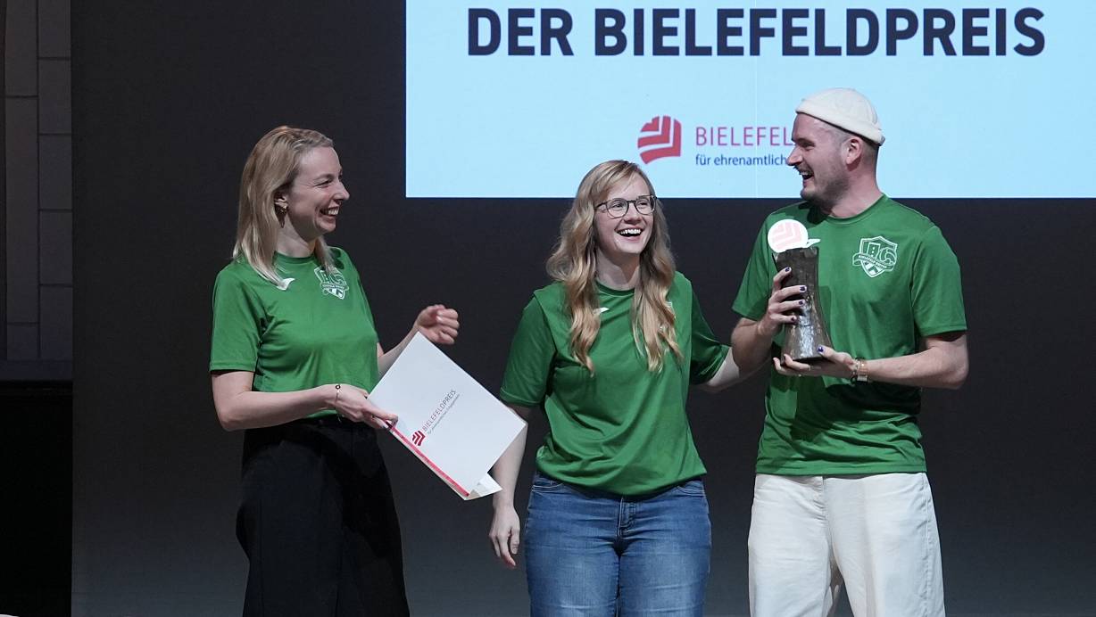 Ehrung für ehrenamtliches Engagement: Janine Leifert, Katharina Höcker und Adrian Arand von „Bielefeld United“ freuen sich über den Bielefeld-Preis. | © Peter Unger